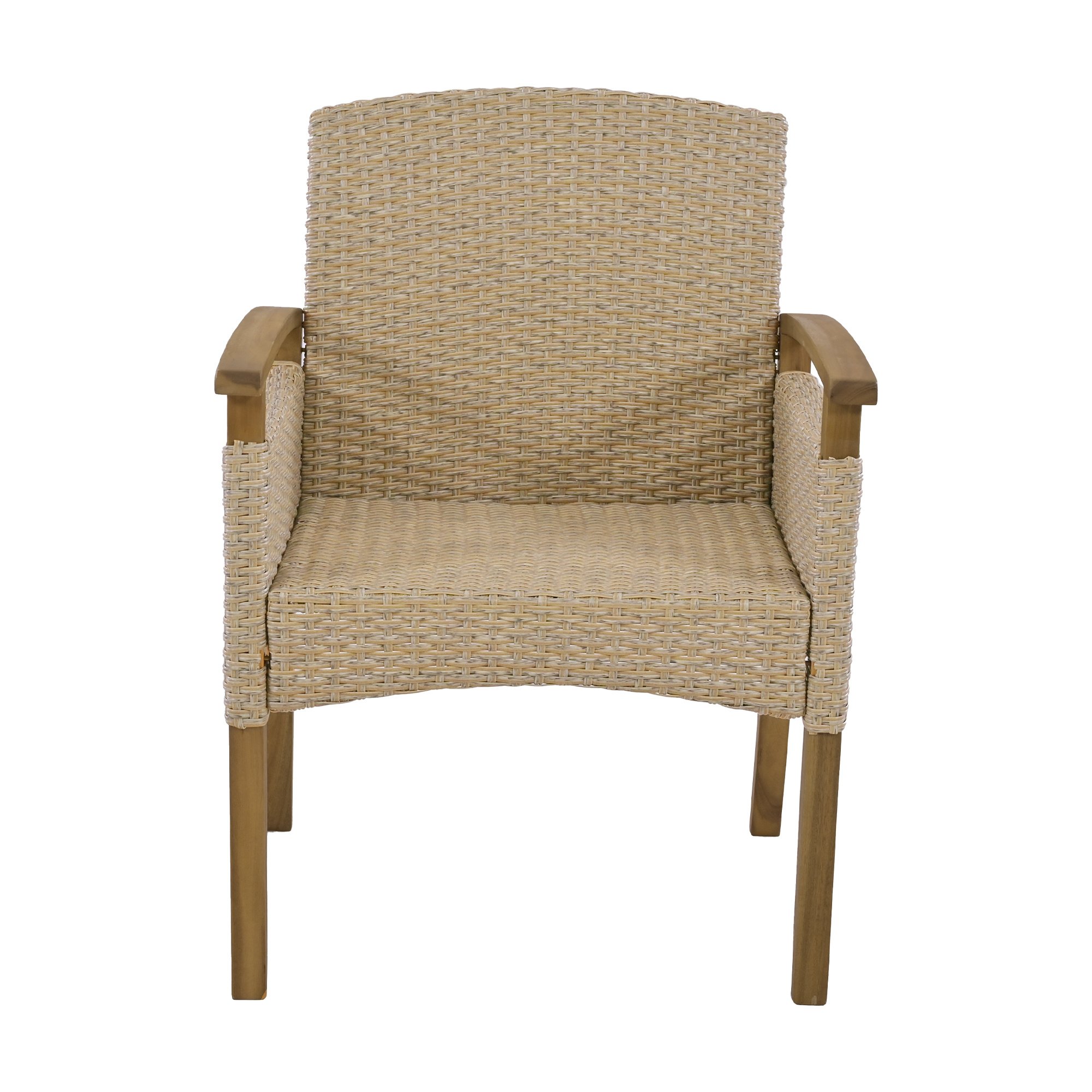 All of the garden dining table and chairs are covered with all-weather PE wickers; which is a durable and weather-resistant material that can withstand outdoor elements such as rain; sun; and wind. The tabletop; chair arm; and chair legs are crafted from premium-grade Acaciawood; a highly sustainable and durable hardwood that is known for its resilience against weather changes and moisture. The tabletop exudes a natural warmth and beauty; while the chair's armrests provide excellent comfort and support. Overall; this patio dining table set is a symbol of elegance; functionality; durability; and comfort; all combined in three outstanding packages.