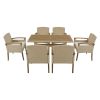 Upgrade your outdoor dining experience with our patio rattan dining set. The set includes a 56.3x29.1inch spacious rectangle dining table with an Acacia wood dining tabletop. It also features a steel table and leg frame hand-woven with water-resistant PE Rattan that provides excellent durability and weather resistance. The table is designed with a narrow shelf under the top for extra storage space; making it a practical choice for your outdoor dining area. The set comes with 6 chairs designed with an ergonomic backrest and armrests for maximum comfort during prolonged use. With easy assembly and all necessary hardware and instructions included; you'll be enjoying meals outdoors in no time.
